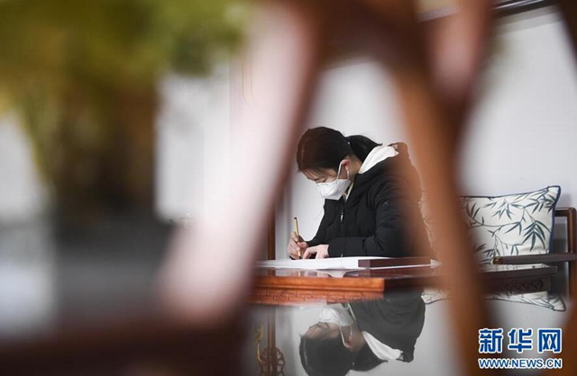 2月6日,重庆市云阳县第三初级中学一年级学生吴雨灿在家中练习书法。(新华社记者 王全超/摄)