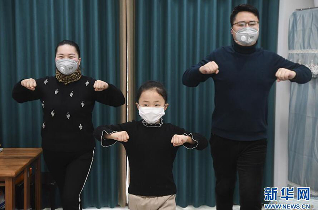 2月6日,重庆市云阳县海峡小学一年级学生周彦希和爸爸妈妈一起在家中做广播体操。(新华社记者 王全超/摄)
