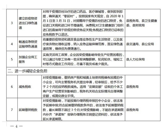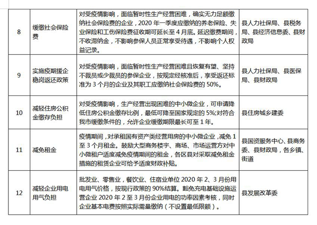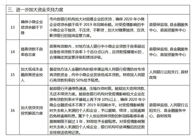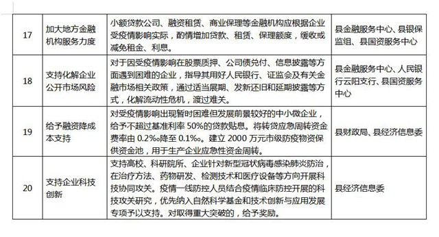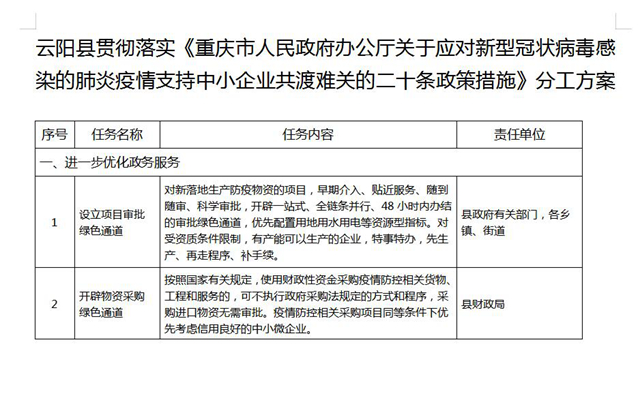 《云阳县贯彻落实〈重庆市人民政府办公厅关于应对新型冠状病毒感染的肺炎疫情支持中小企业共渡难关的二十条政策措施〉分工方案》,已经县政府同意,现印发给你们。请各单位根据职能职责,主动对接市级部门,认真研究细化各项政策措施,切实抓好各项政策措施落地落实。