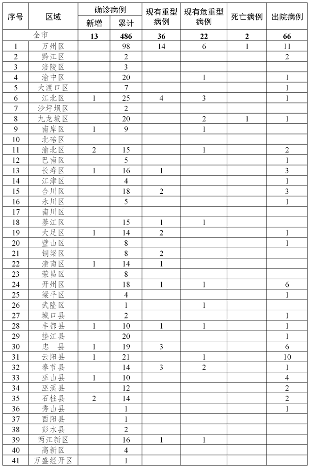 新增确诊病例中,江北区1例、南岸区1例、渝北区2例、长寿区1例、大足区1例、潼南区1例、丰都县1例、忠县1例、云阳县1例、巫山县1例、石柱县2例;新增重型病例中,万州区2例、江北区1例;重型病例转普通型病例为长寿区1例;新增出院病例中,黔江区2例、合川区1例、大足区1例、忠县2例。