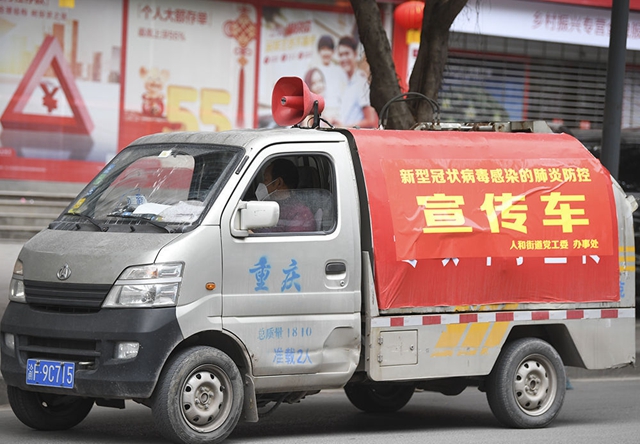 ↑2月4日,通过车载广播进行疫情防控宣传的车辆经过重庆市云阳县人和街道。 新华社记者王全超摄