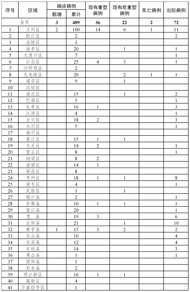 新增确诊病例中,万州区2例、奉节县1例;新增出院病例中,开州区2例、奉节县1例、巫溪县2例、石柱县1例。