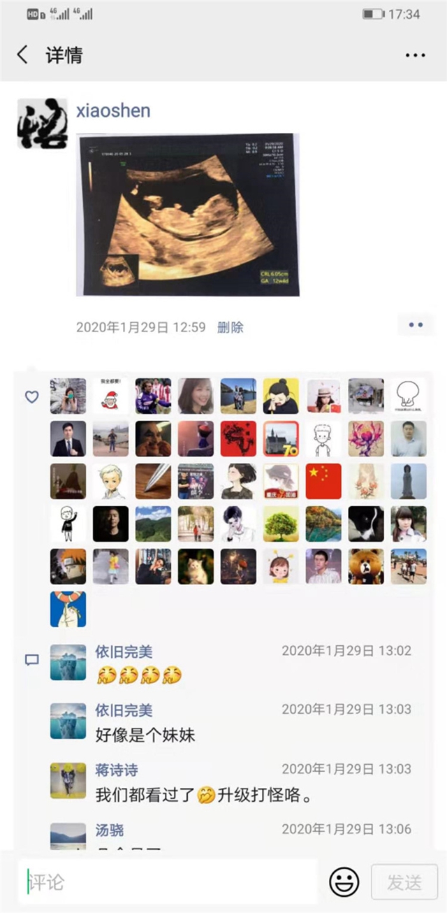 由于孕反十分严重,王丽珍在1月29日做好层层防护,独自一人去医院进行必要的产检。当天下班后,向来不爱发朋友圈的申邓分享了一张B超图片,图里胎儿的雏形可见,没有任何的文字,却能感受到申邓为人父的激动。同事们纷纷点赞留言,送上祝福,说这是我们的“执法二代”,“年龄最小的执法队员”……