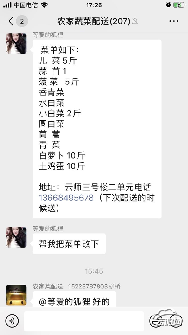 云阳网讯(记者 王彬彬 通讯员 谢蜀云)“小草的订单:儿菜2斤,蒜苗1斤,小白菜2斤,白萝卜10斤。地址:碧水蓝天。电话:……”