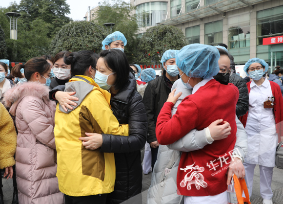 前来送行的同事们紧紧相拥,相互鼓劲。华龙网-新重庆客户端记者 张质 摄