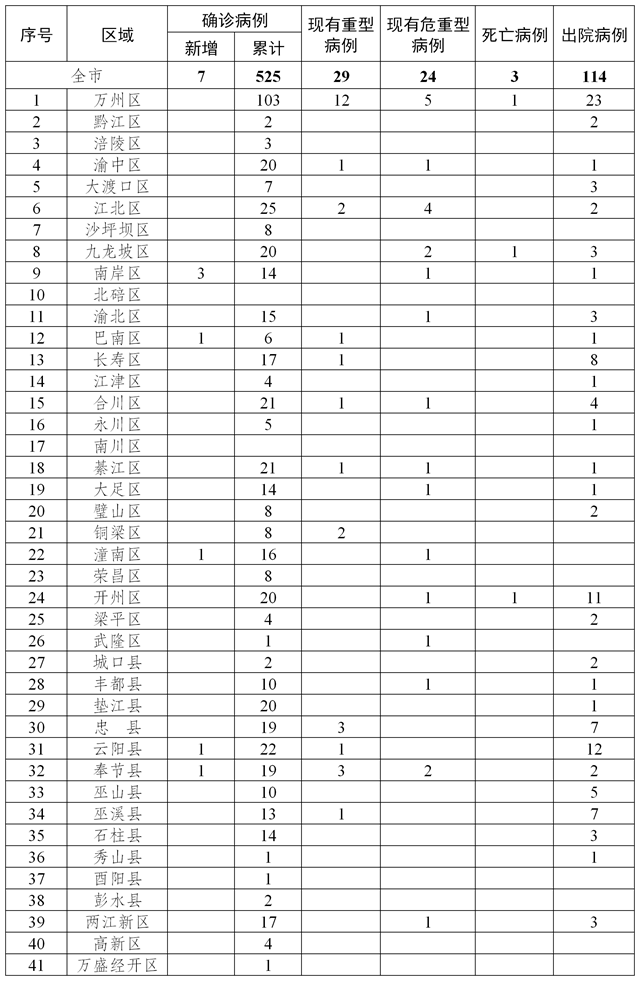 新增确诊病例中,南岸区3例、巴南区1例、潼南区1例、云阳县1例、奉节县1例;新增出院病例中,万州区7例、合川区1例、城口县1例、云阳县1例、巫山县1例、巫溪县1例。