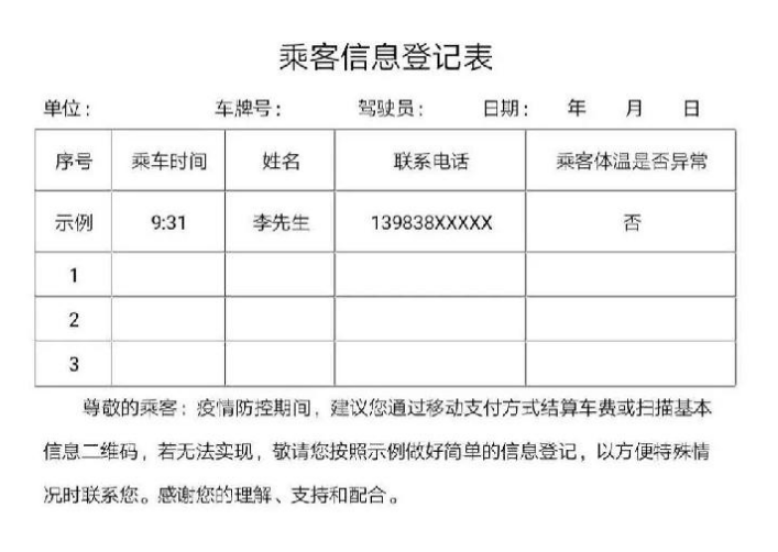 从2月17日起至主城区疫情防控结束,主城区出租车启用实名登记乘车。主城出租车将统一在车内张贴乘客乘车二维码,对通过非移动支付方式结算的乘客,乘车前实行扫码登记,扫码时只提取乘客手机号码,不提取其它任何信息。对未携带手机或使用手机不便无法使用移动方式支付的乘客,由驾驶员引导乘客做好手工信息登记,登记信息主要为乘客手机号码,登记表式样见附表,由各出租车经营者发放给驾驶员,并在第二天安排专人收集、录存。凡通过移动支付方式结算乘车费用的乘客,在支付费用时已自动提取手机信息,不用再扫乘车二维码。搭乘网约车的乘客,在呼叫车辆时手机号码已提取,因此网约车内不用张贴乘车二维码。