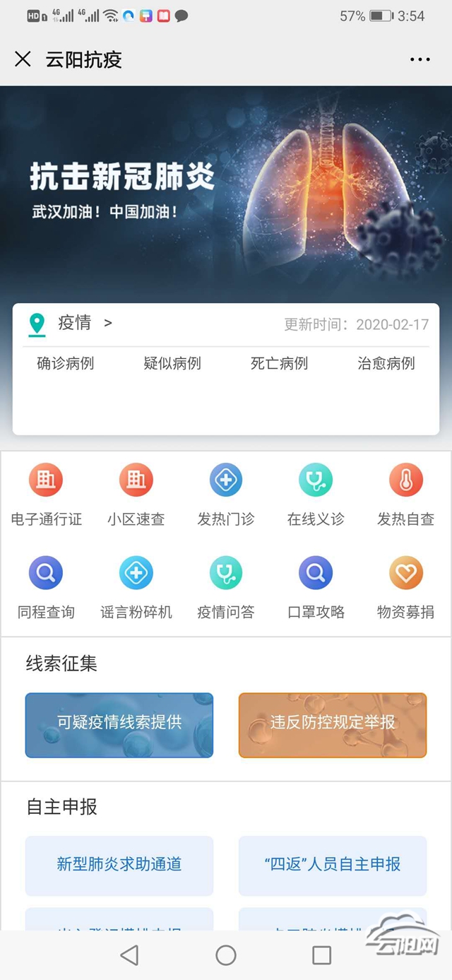 值得一提的是平台面向普通用户、企业用户、街道社区、小区物业等类型用户,开发了“全民抗疫””微信公众号以及微信端链接,提供出入登记、线索征集、自主申报和求助通道权限;提供企业防疫专栏、政府通告、复工申请、