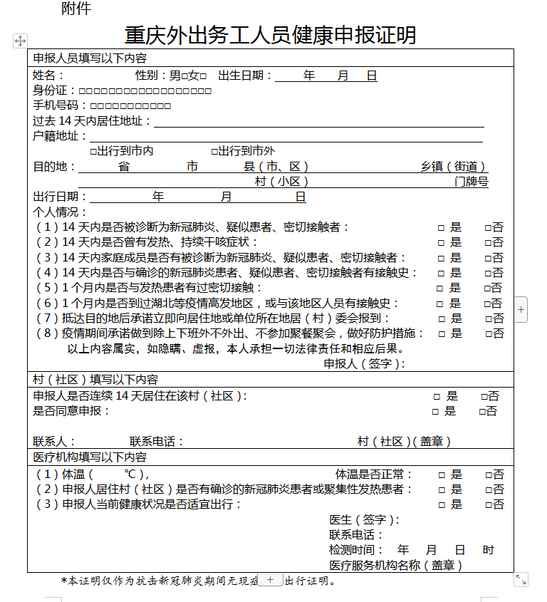 (二)服务内容。居住地医疗卫生机构对有外出务工需要的申报人在开展流行病学史调查和测量体温的基础上,为符合条件的申报人员免费出具市卫生健康委印制的《重庆市外出务工人员健康申报证明》(详见附件,以下简称证明)