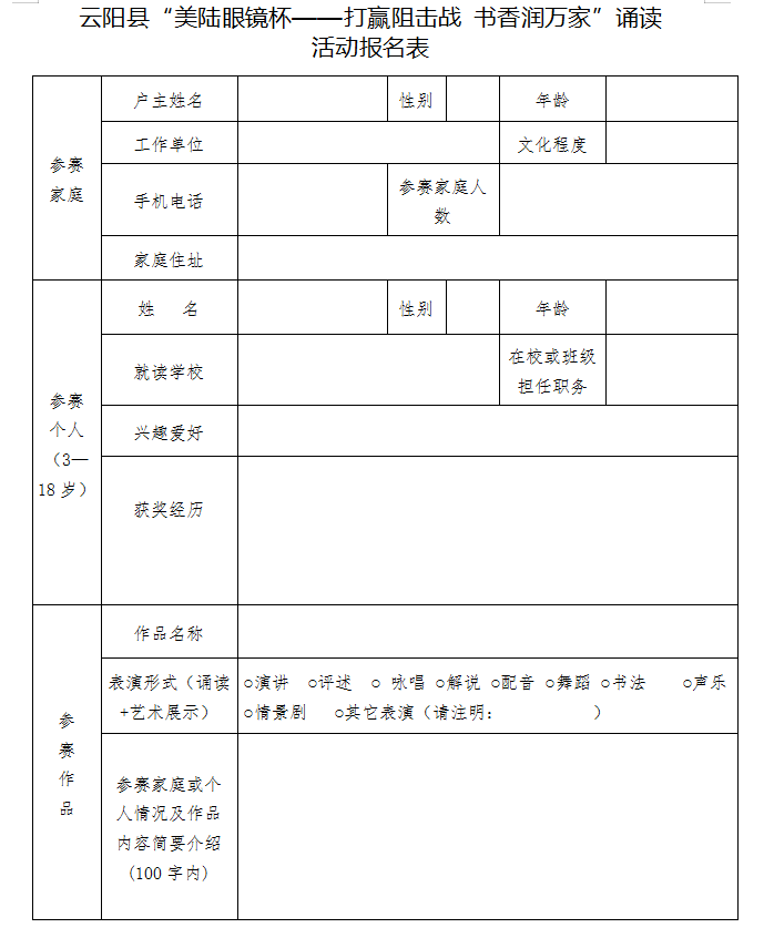 活动分为家庭参赛和个人参赛两种形式。家庭参赛对象为云阳县常住家庭,参与家庭至少推选2名家庭成员参加,且其中至少1名为18周岁以下的未成年人。个人参赛对象为云阳县3至17岁青少年儿童,可单独或组队参赛。参赛人员需录制参赛视频,时长为1~3分钟,分辨率480P以上,画质清晰,MP4格式,作品名称为“姓名+诵读作品名称+联系电话”,并附上电子版报名表和1 张参赛作者家庭生活照,发送至邮箱mengyuanma@zxllet.com进行投稿,投稿联系人:马梦媛,电话:18323127261。