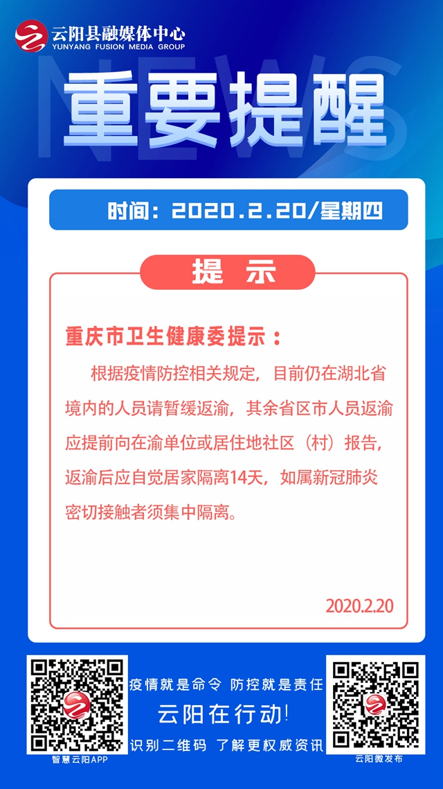 重庆市卫生健康委提示:根据疫情防控相关规定,目前仍在湖北省境内的人员请暂缓返渝,其余省区市人员返渝应提前向在渝单位或居住地社区(村)报告,返渝后应自觉居家隔离14天,如属新冠肺炎密切接触者须集中隔离。