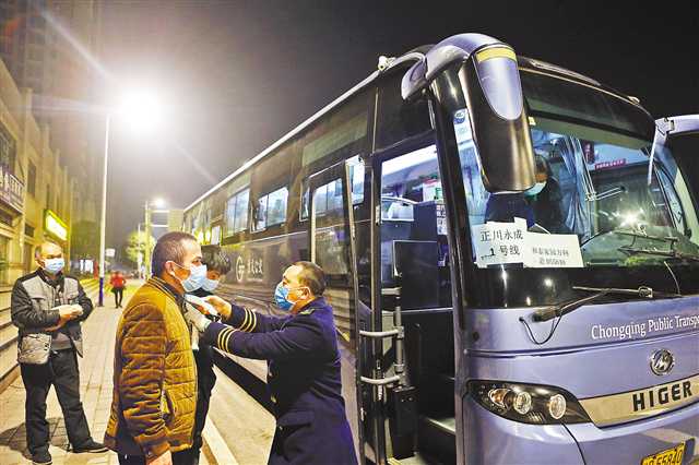 二月二十日清晨,两江公交机场快车驾驶员王成云和同事驾车接送企业员工,并对每位上车乘客进行体温测量。记者 罗斌 摄