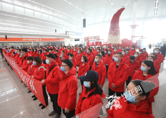 江北机场T3航站楼,重庆第十四批支援湖北医疗队173人集结出发。华龙网-新重庆客户端记者 张质 摄