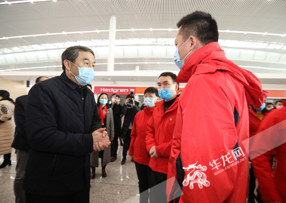 重庆市卫健委党委书记、主任黄明会(左)嘱咐医疗队队员们注意防护,平安归来。华龙网-新重庆客户端记者 张质 摄