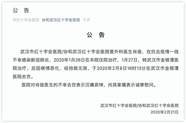 还有在武汉市红十字会医院工作了29年的肖俊医生,也在2月8日倒在了抗疫一线。