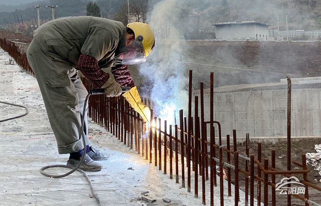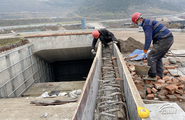 施工现场,工人们正忙着焊接护栏、加固模板,几辆工程车来回穿梭,路基铺设、土方回填施工正在有条不紊地开展。