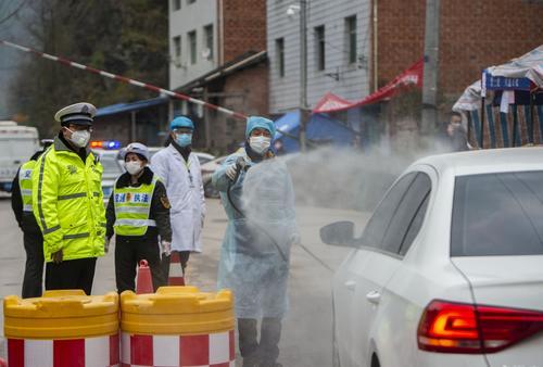 ▲2月14日,万州区龙驹镇,交警等部门组成的联防联控队伍正在对来往车辆进行消毒。记者 龙帆 摄