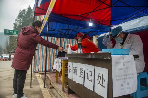 ▲2月14日,万州区龙驹镇,万州与利川交界的苏拉口卡点,由公安、交通、卫生、交警等部门组成的联防联控队伍正在对来往车辆、人员疫情检查并登记。记者 龙帆 摄