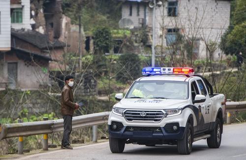 ▲2月14日,万州区龙驹镇,公安人员在万州与利川交界的苏拉口卡点巡逻时对来往人员进行劝导。记者 龙帆 摄
