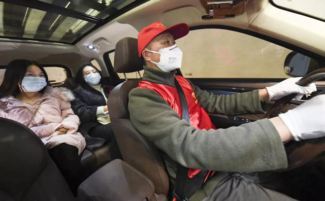 2月6日晚,重庆市云阳县“疫情防控”志愿服务车队志愿者郭高平开车送云阳县人民医院的医护人员上夜班。新华社记者 王全超 摄