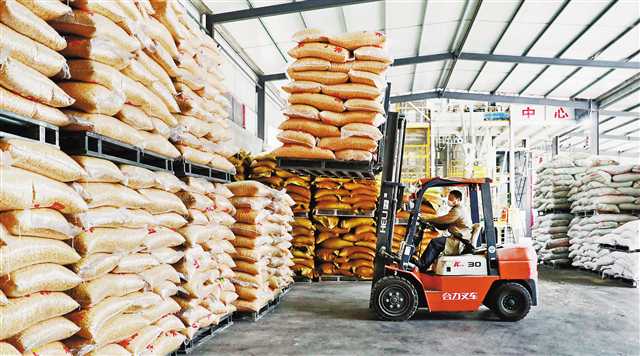 2月24日,酉阳小坝全民创业园一饲料生产企业,员工驾驶叉车搬运原材料。该县在企业防疫措施到位、部门验收合格的情况下,组织企业有序复工复产。通讯员 杨春来 摄
