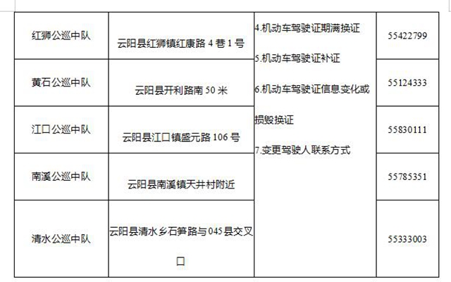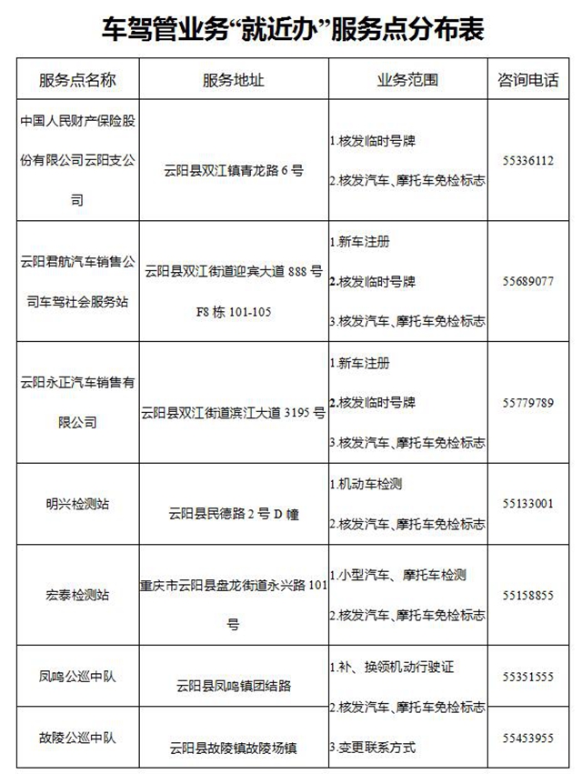 ①驾驶证年审:在云阳县人民医院、双江人民医院,江口第二人民医院、车管所楼上中医院体检中心体检后,现场办理驾驶证年审业务,不需要再到交巡警大队办理。注意:驾驶证年审超期、交通违章未处理的,体检后需到交巡警大队办理驾驶证年审业务。