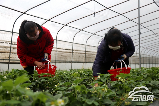 云阳网讯(记者 郑红均 朱学徽)3月3日,记者在凤鸣镇阳之凤生态采摘园看到,一颗颗鲜红的草莓已经挂满,2名工人带着口罩、提着篮子正在大棚内采摘草莓。
