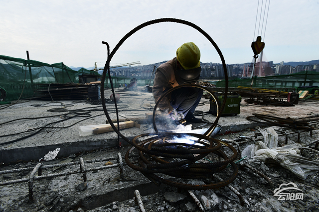 云阳县长江大桥南桥头互通提速扩建工程工地上,一名电焊工在忙着拼接钢模为混凝土浇筑者上工干活备好材料。