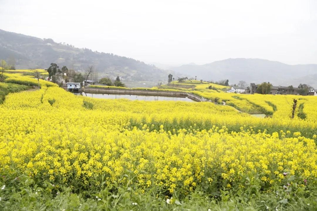 “清风吹拂金波涌,飘溢醉人浓郁香。”远远望去,那一抹金黄的光泽,与宁静的村庄、清澈的池塘相映成趣,勾勒出一幅美丽清新的乡村田园诗画。
