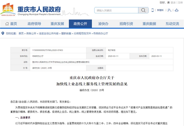 3月11日,重庆市政府网发布《重庆市人民政府办公厅关于加快线上业态线上服务线上管理发展的意见》(后简称“意见”)。