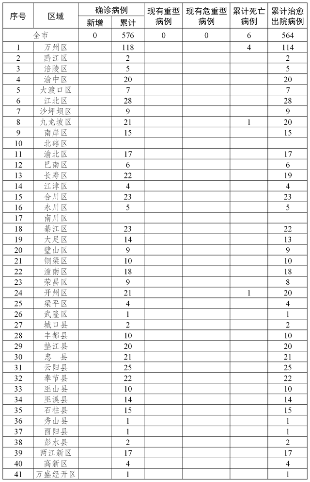 新增治愈出院病例中,江北区1例、沙坪坝区1例、九龙坡区2例、南岸区1例、綦江区1例、铜梁区1例、潼南区1例、丰都县2例。