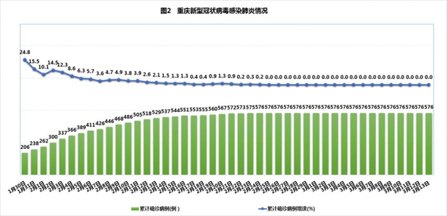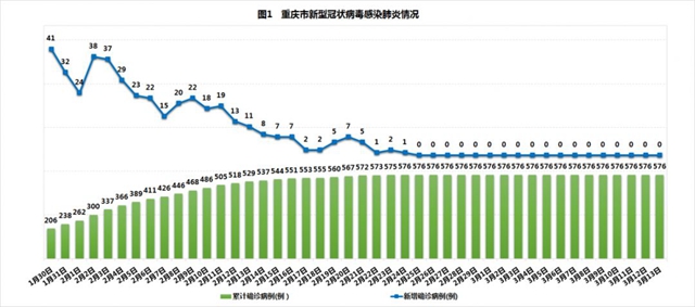 市卫生健康委通报,3月13日0—24时,重庆无新冠肺炎新增确诊病例报告,新增治愈出院病例2例。截至3月13日,现有在院确诊病例4例(无重型和危重型病例),累计死亡病例6例,累计治愈病例566例,累计报告确诊病例576例。累计排除3532例疑似病例,现无疑似病例待排查。累计追踪到密切接触者23688人,已解除医学观察23606人,尚有82人正在接受医学观察。