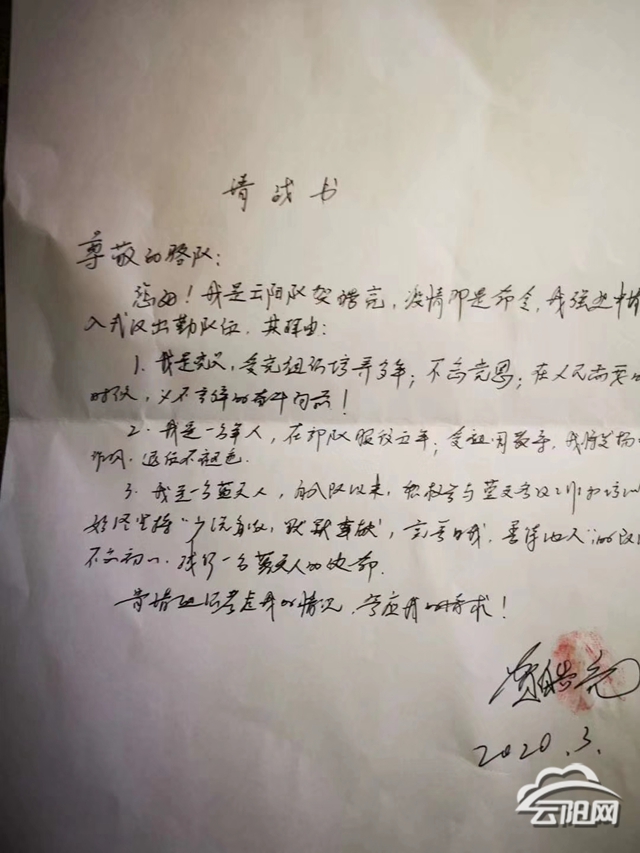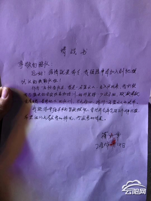 在贺皓亮的请战书中写道:“我是一名党员,受组织培养多年,不忘党恩,在人民群众需要帮助时,义不容辞理应奋勇向前。”贺皓亮是一名退伍军人,也是孩子的父亲、父母的宝贝儿子。“我的每一个身份都告诉我,我必须向前。我希望能给儿子树立一个好榜样。”贺皓亮眼神里充满坚定。