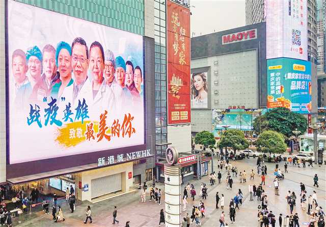 • 3月15日,江北区观音桥商圈,LED屏幕正播放战“疫”英雄形象短片。记者 万难 摄