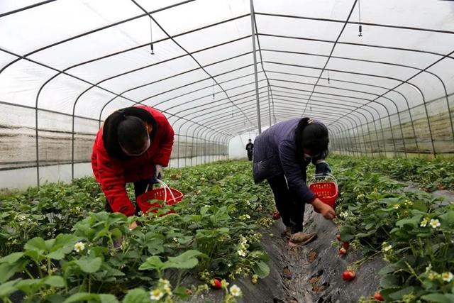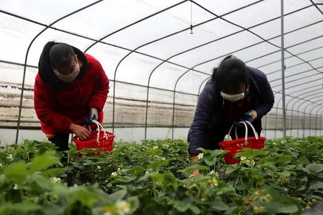 近日,小编在凤鸣镇阳之凤生态采摘园看到,一颗颗鲜红的草莓点缀在绿叶间,两名工人戴着口罩、提着篮子正在大棚内采摘草莓。