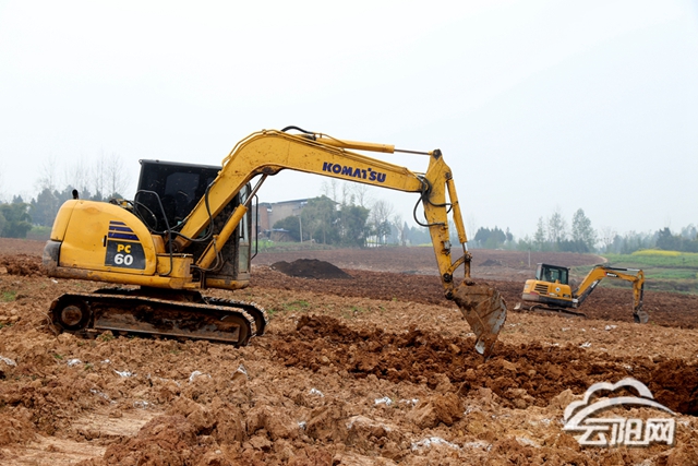 在阳凤村一亩良园农业发展有限公司的果园内,几台挖掘机正在作业,工作人员正在划线,为引进李子树做规划。