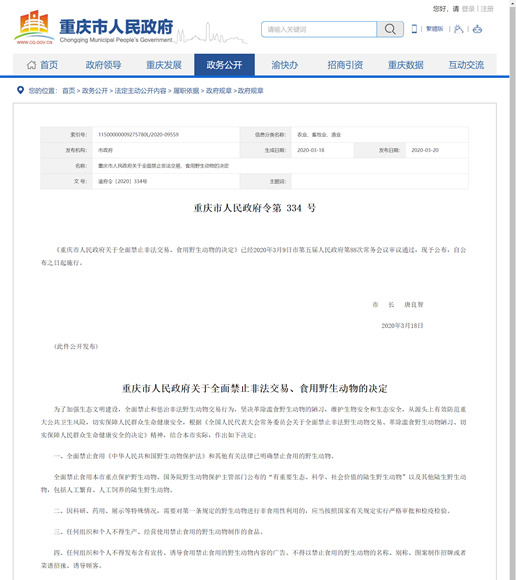 • 重庆市人民政府关于全面禁止非法交易、食用野生动物的决定。(网页截图)