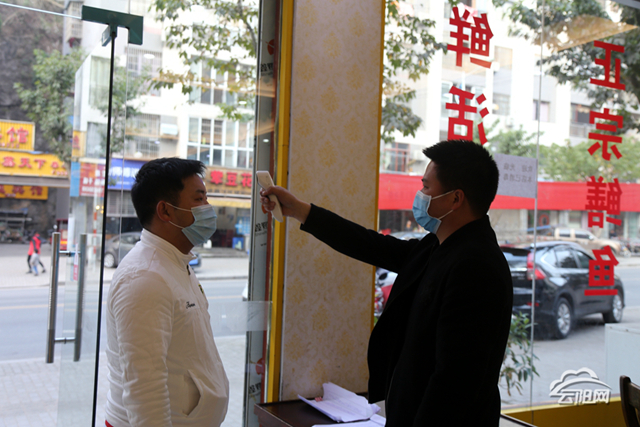 3月23日,记者来到凤鸣镇场镇。在一家餐饮店门前,工作人员正为前来吃饭的顾客测量体温,并提示顾客洗手、消毒。