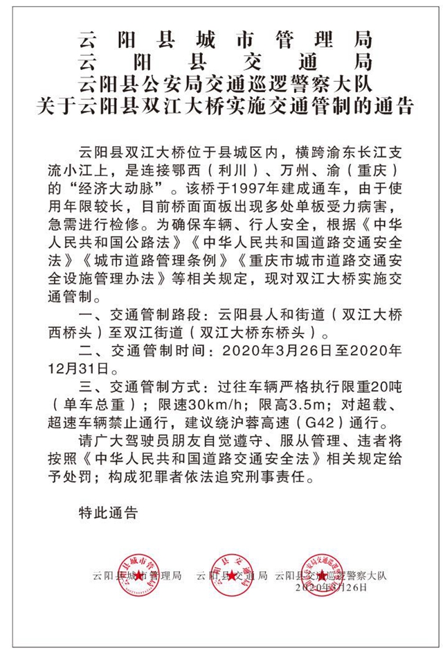 • 转发扩散!云阳双江大桥实行交通管制,具体时间是...