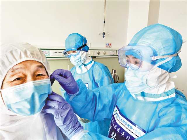 3月18日,重庆医疗队医生正在为即将出院的患者换上隔离服。