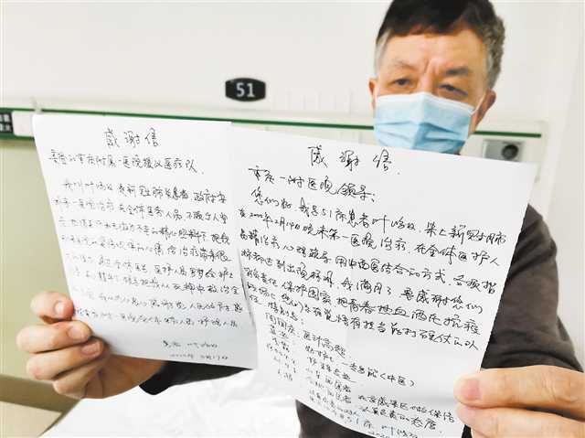 3月17日,武汉市第一医院,一名即将出院的患者展示他写给重庆医疗队的感谢信。
