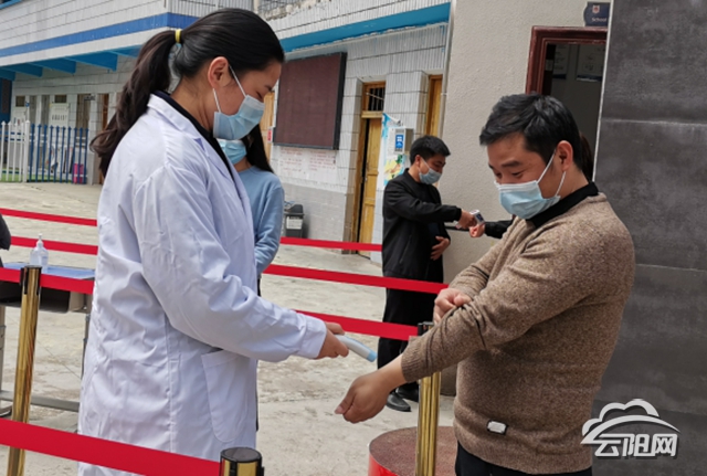 当日上午,由教职工扮演的学生在校门口指定位置,按要求分批次、分通道依次入校。校门是校园的第一道防线,必须严防死守。进校时,检查人员首先检查学生是否规范佩戴口罩、是否站在一米间距红线上,然后测试体温,检查消毒洗手等情况。对于体温≥37.3℃的学生,检查人员将及时通知班主任联系家长,同时走专用通道将其送至临时隔离区。学校消毒人员对校园校门、测温通道和隔离观察室等场所及时消毒处理。