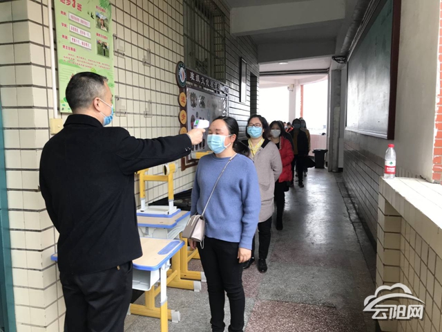 演练中,教师代替学生,根据学校实际情况设置了不同的场景。“师生”到校入校,校门口消毒,“师生”入校,有序通过测温通道测温,并检查询问登记“学生”健康状况。入校后,“学生”间距1米排队,按照各班教学楼位置通过指定线路走到各个教室。该校教师还对“学生”晨午检、“学生”进入教室戴口罩上课、教室消毒、排队取餐、就餐进行了演练。