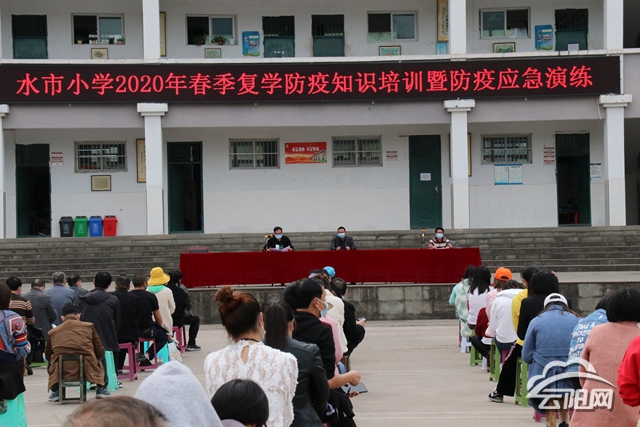 云阳网讯(通讯员 朱伟)“请各位‘同学’、测温员、保安、引导员、隔离员、值周教师,火速到达指定岗位……”近日,水市小学开展2020年春季复学防疫知识培训暨防疫应急演练。