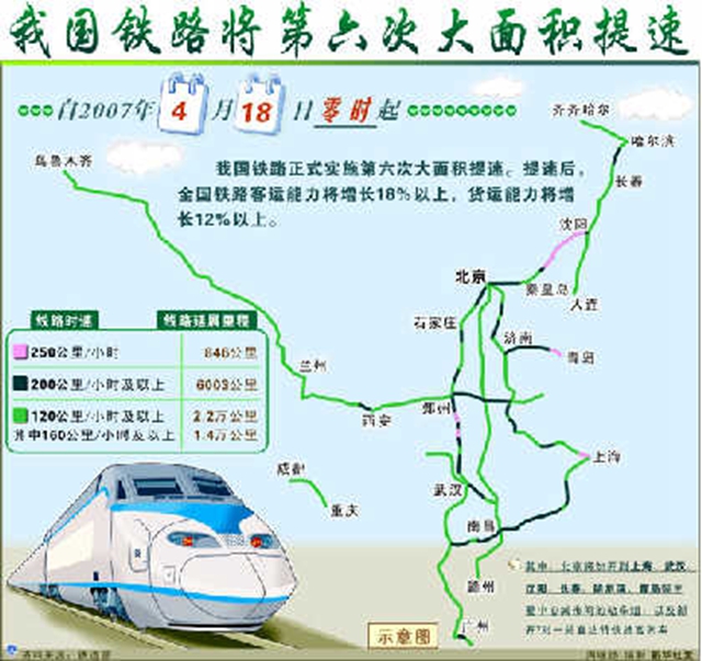 2.【零时起,全国铁路正式实施第六次大面积提速】2007年4月18日零时起,中国铁路第六次大面积提速调图正式付诸实施,主要干线开始“时速200公里”的高速运行,中国铁路开启“追风时代”。
