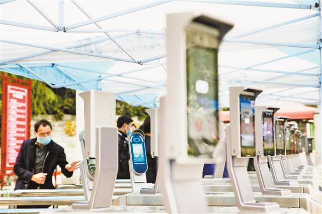 四月十八日,黔江中学工作人员对学校门口的红外线测温仪进行检查。特约摄影 杨敏