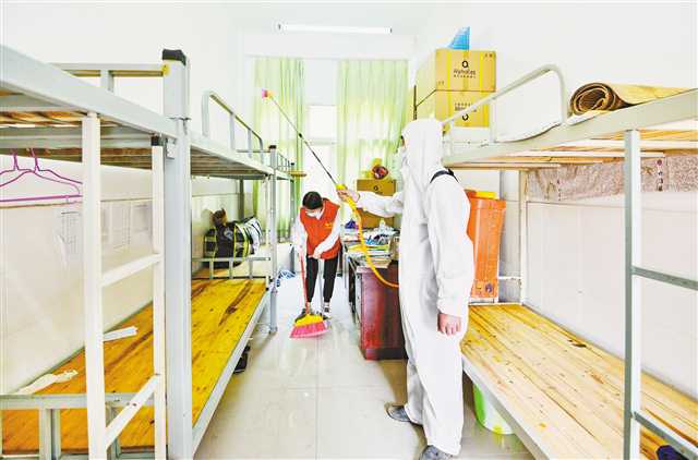 四月十六日,渝北区大湾镇高嘴学校,志愿者在宿舍做清洁消毒。记者 齐岚森 摄