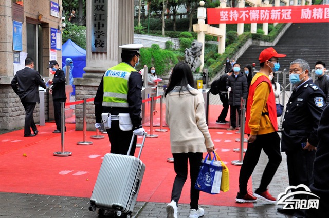 根据统一安排,双江中学高三和初三年级同学当天下午开始陆续返校,县交巡警大队双江中队民警和志愿者们早早守候在这里,协助学校开展交通疏导、人员分流、疏散管控、行李搬运和排查登记等工作,暖心提醒学生要戴好口罩,确保自身安全。“我们开学前已经对校园周边秩序进行了安全隐患排查,今天我们也增派了足够的警力,还有我们的志愿者一起为初三高三学子保驾护航,”双江中队民警易鑫源说到。