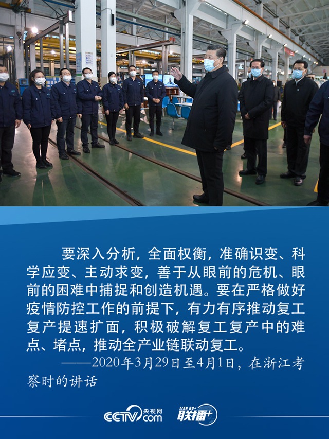从“适时启动”到“积极破解”难点、堵点,再到“全面推进”,习近平辗转三地,释放出在毫不放松疫情防控的前提下,加快恢复生产生活秩序、加快推动复工复产的积极信号,为企业复工复产和社会生活秩序恢复注入了“强心剂”。