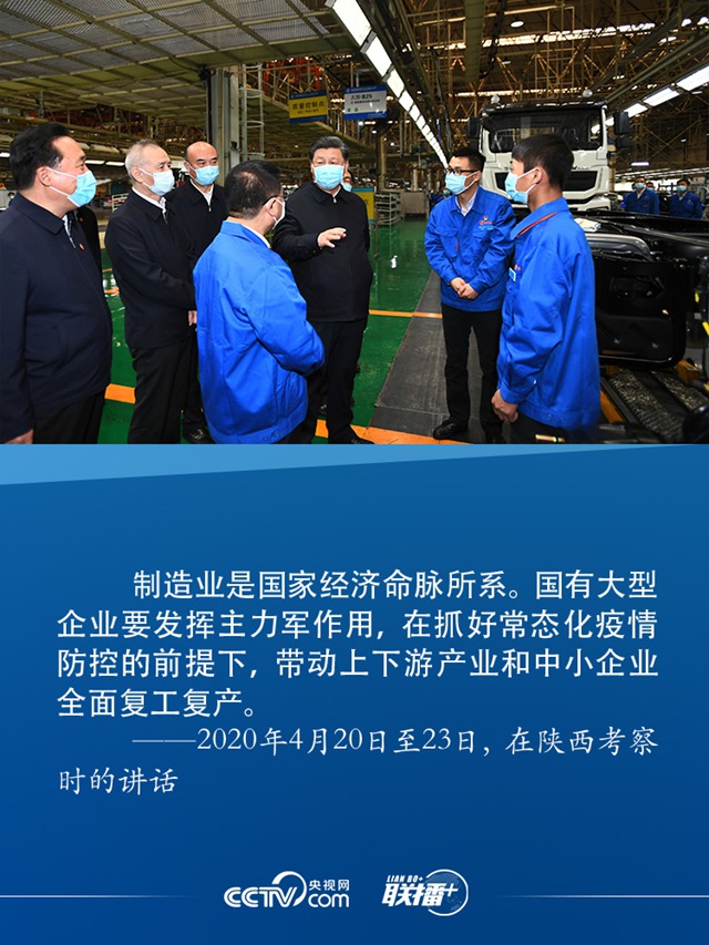 4月22日,习近平来到陕西汽车控股集团有限公司总装车间察看生产线,了解产品研发、生产、销售和复工复产情况,对他们克服疫情影响创产销历史新高表示赞赏。